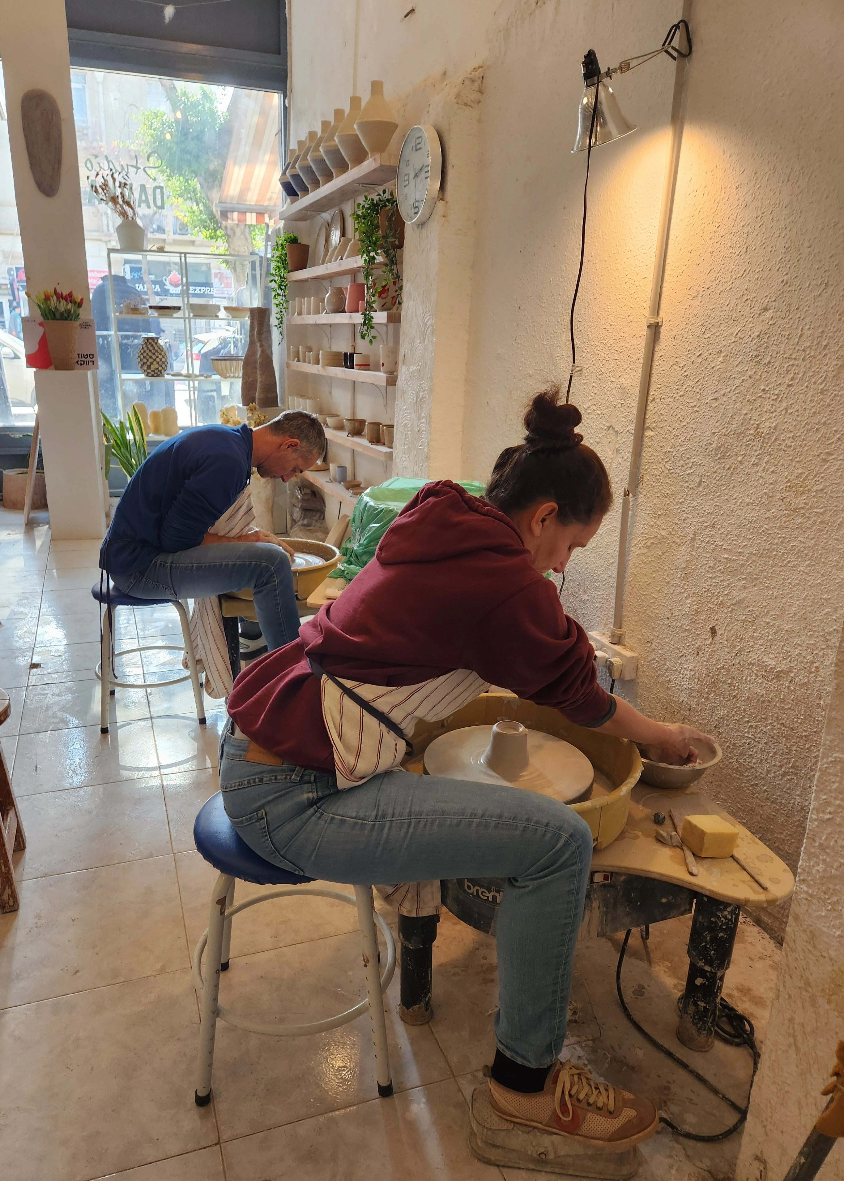 בסוף הגענו לסדנה קטנה וחמודה בחיפה ושם עבדנו על אובניים למשך שעתיים ושכחנו מהחיים האמיתיים. זה מה שיצא