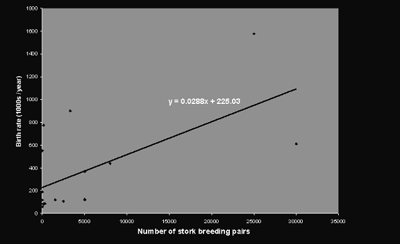 Here is one showing a correlation (p-value < 0.01) between the number of breeding stork pairs and human births is some European countries (by Robert Matthews Aston University):