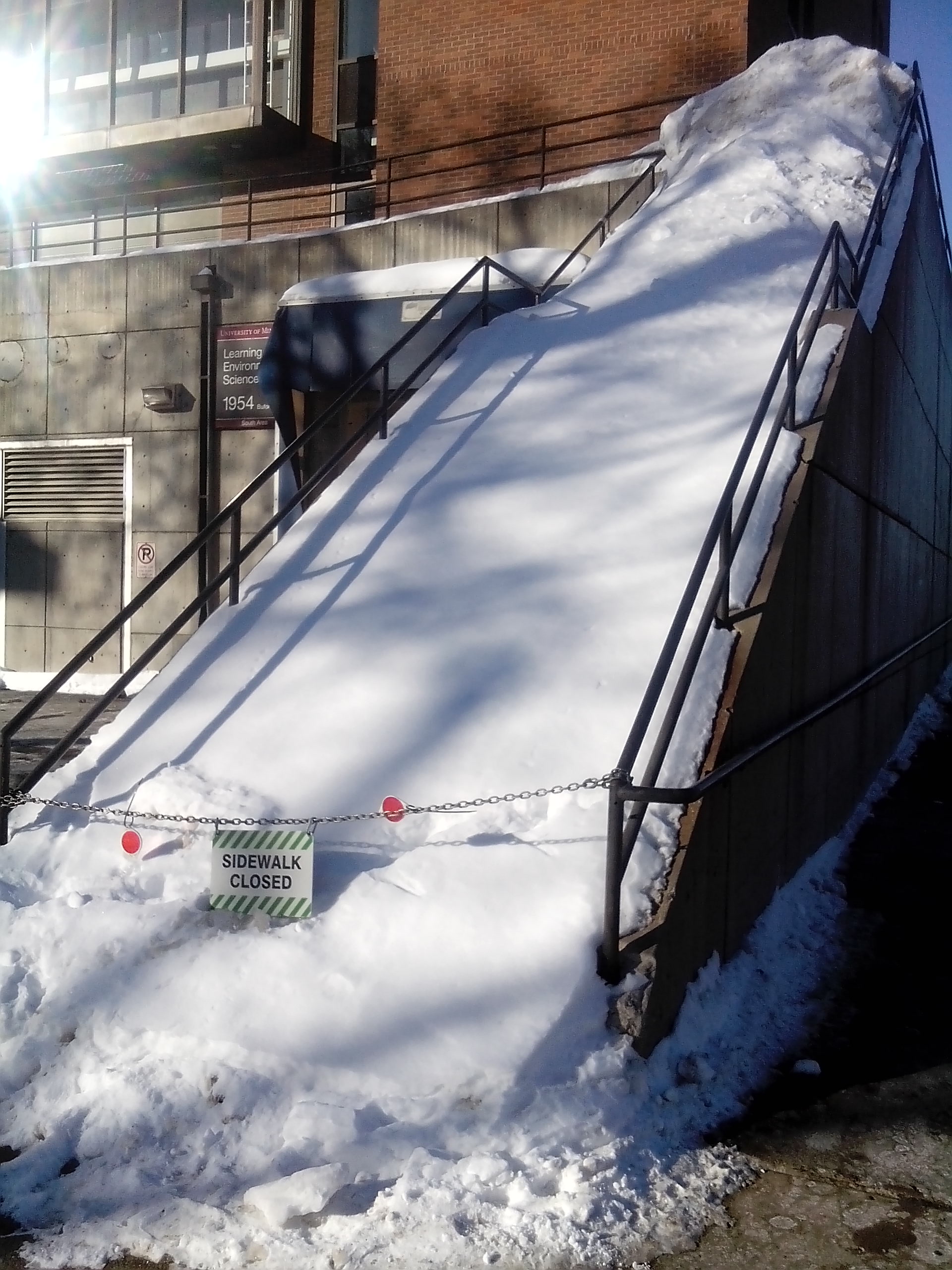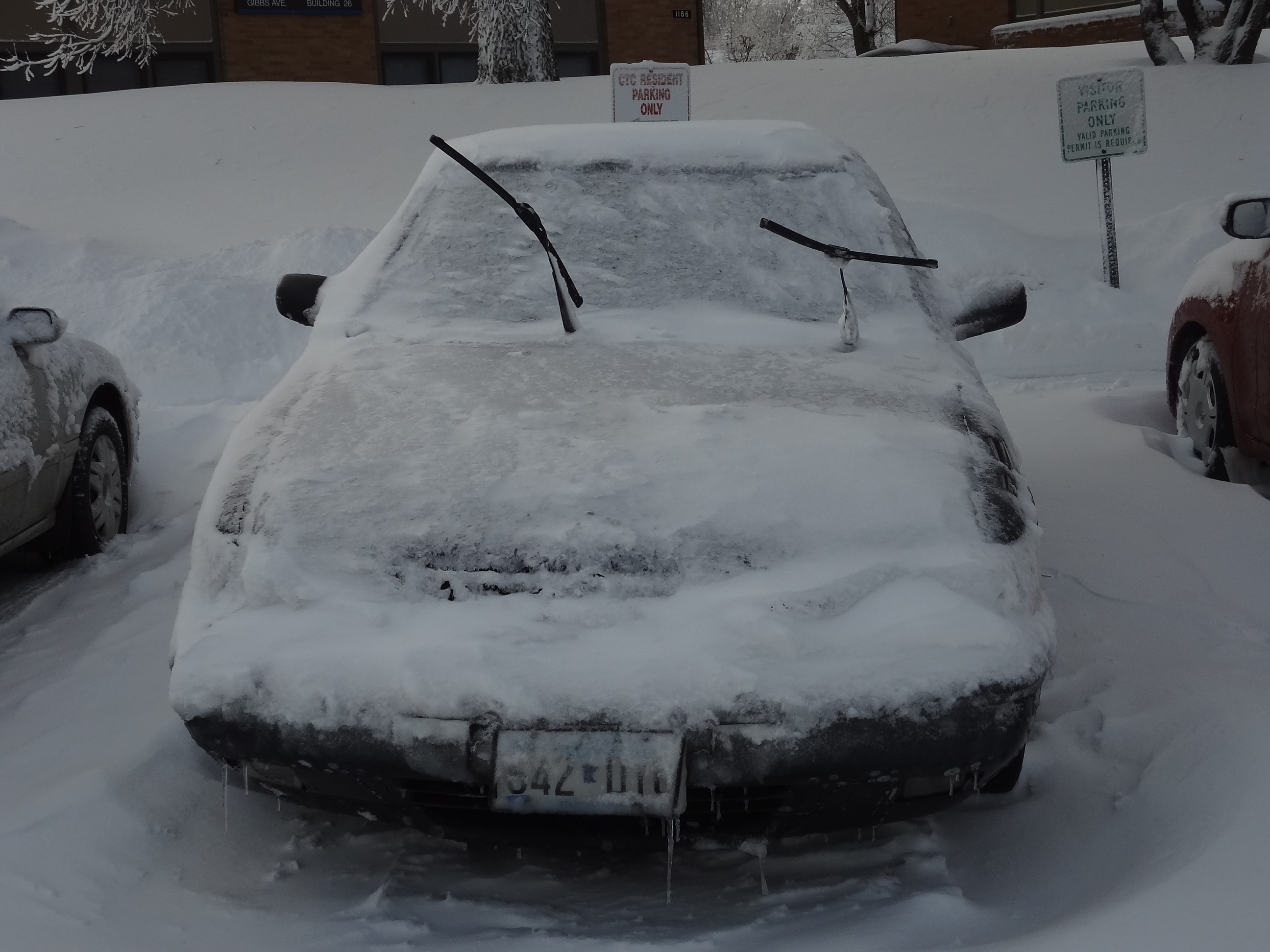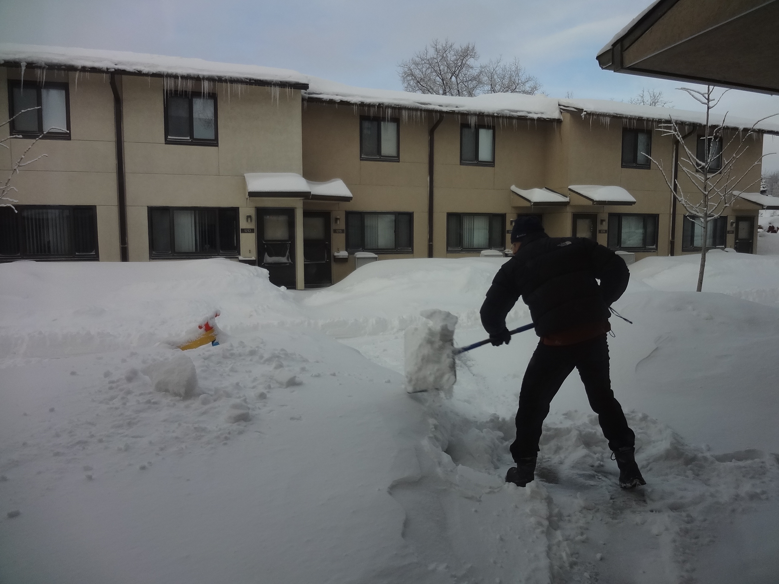 בנוסף לקור העז גם ירד יותר שלג מהרגיל ולא נמס כל החורף. בתחילת פברואר מגרש החנייה שלנו הפך לאסון טבע: ערימות של קרח ושלג ובינם ומכוניות שתחתן שכבת קרח עבה שאין לשוברה אלא עם קרדום קרח (שאגב מוכרים כאן בדיוק למקרים כאלו). המכוניות מכונסות ומצופפות יחדיו, שומרות כך על מעט חום מנוע ללילה הארוך – עד להתנעה של הבוקר . מי שכוחו במותניו יצא בקור הבלתי נסבל ופינה כל בוקר את השלג מסביב המכונית, ואלו שאין להם היכולת, עמדו בפני מכונית קפואה היושבת על שרטון קרח, ומקום חנייה שאין לחנות בו