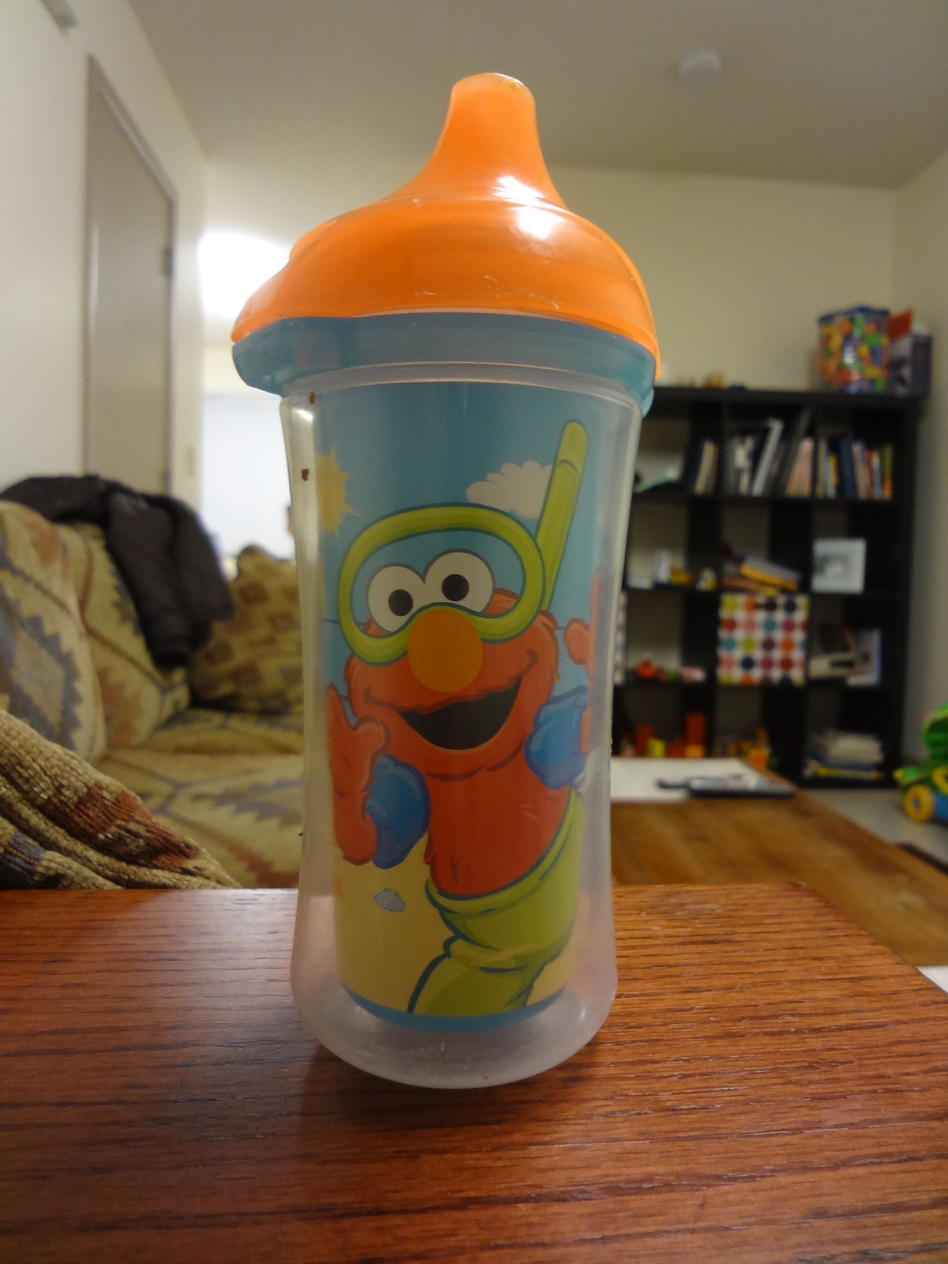 עד לא מזמן אילון היה שותה מבקבוק עם פטמה. זה היה נעים לו בפה וככה מאון לאון הוא היה שותה המון מים, מה שגרר המון החלפות חיתולים ובלגאן. ע"מ לעבור לשתות מכוס, קנינו לו כוס גדולה וצבעונית עם תמונה של אלמו, מי שלא מכיר- זה מרחוב סומסום