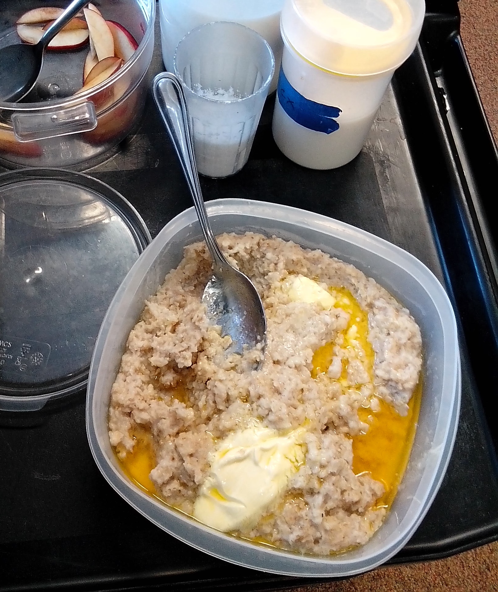 ובכלל, המידות הבסיסיות של מה סביר לאכול ומה לא, שונות כאן בתחלית. הכל מלוח יותר מבארץ, ואם עשית את הטעות וביקשת סוכר בקפה, תקבל סוכריית וורטרס אורגינל נוזלית. הנה למשל תמונה של ארוחת הבוקר בגן של אילון. ברוב הבקרים דווקא ארוחת הבוקר שלהם עושה לי חשק – פנקייקים חמים עם פירות או בייגל עם גבינת שמנת. אבל באותו הבוקר הגיעה טבחת חדשה והכינה דייסת שיבולת שועל