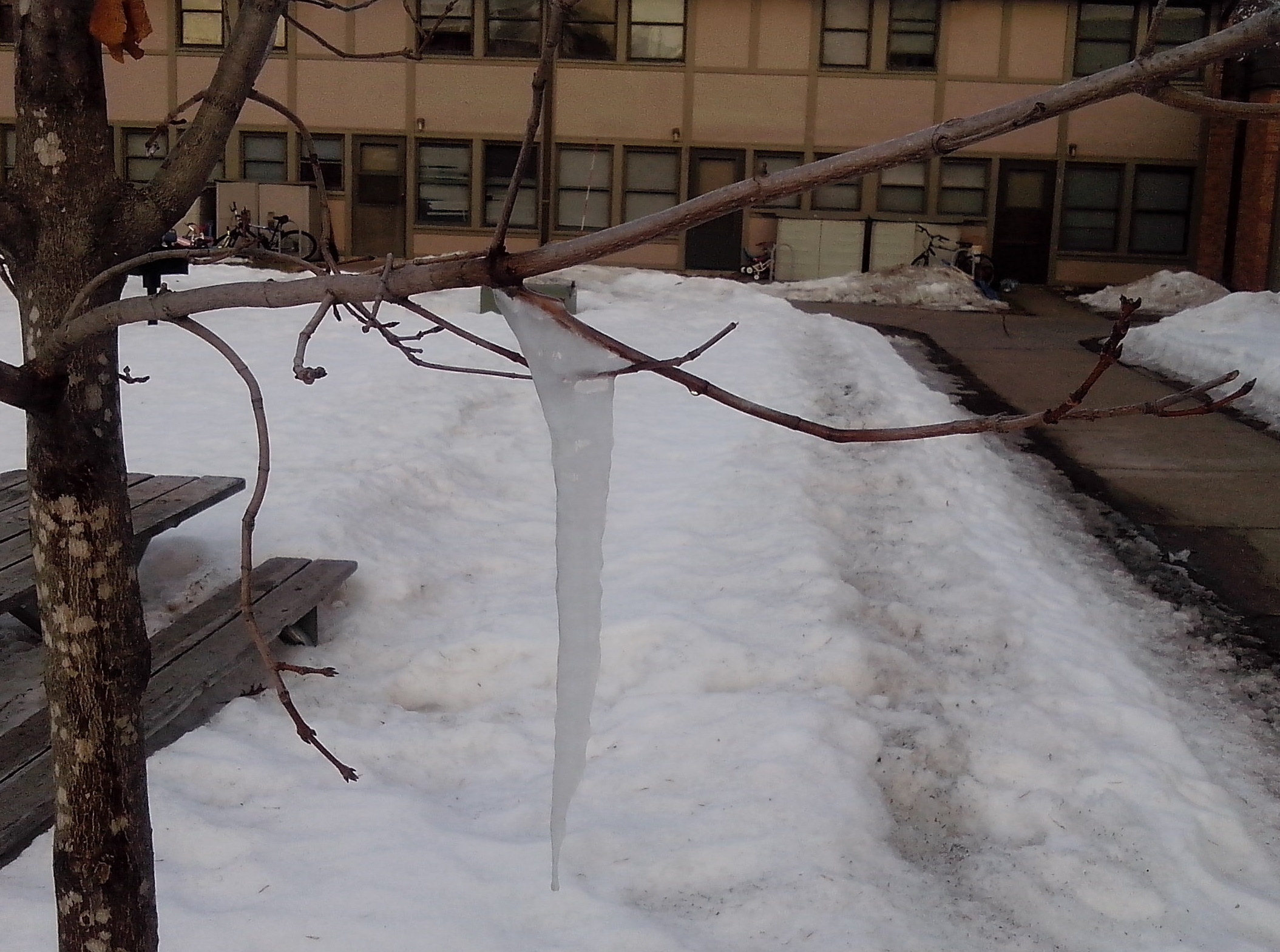 אבל בהחלט לא הכל רע, בעיקר למי שאוהב תופעות מזג אוויר, כמוני, החורף כאן מספק מאגר בלתי נדלה של תופעות מעניינות. הנה למשל ענף שאיתרע מזלו להשבר בחורף, והמים שזלגו מהגדם נאספו לנטיף