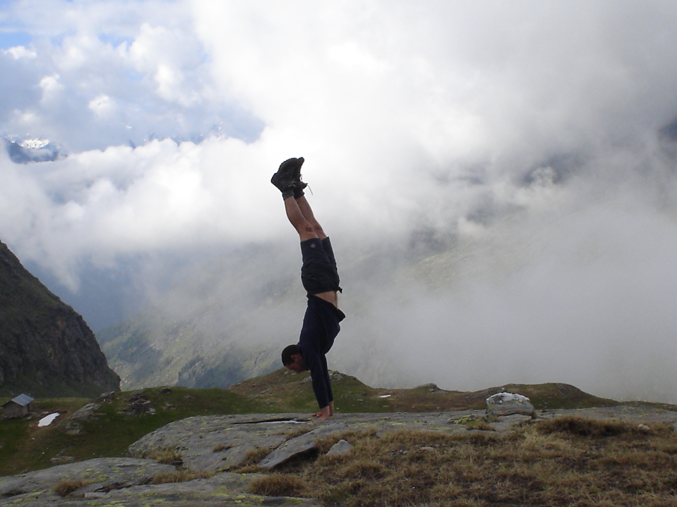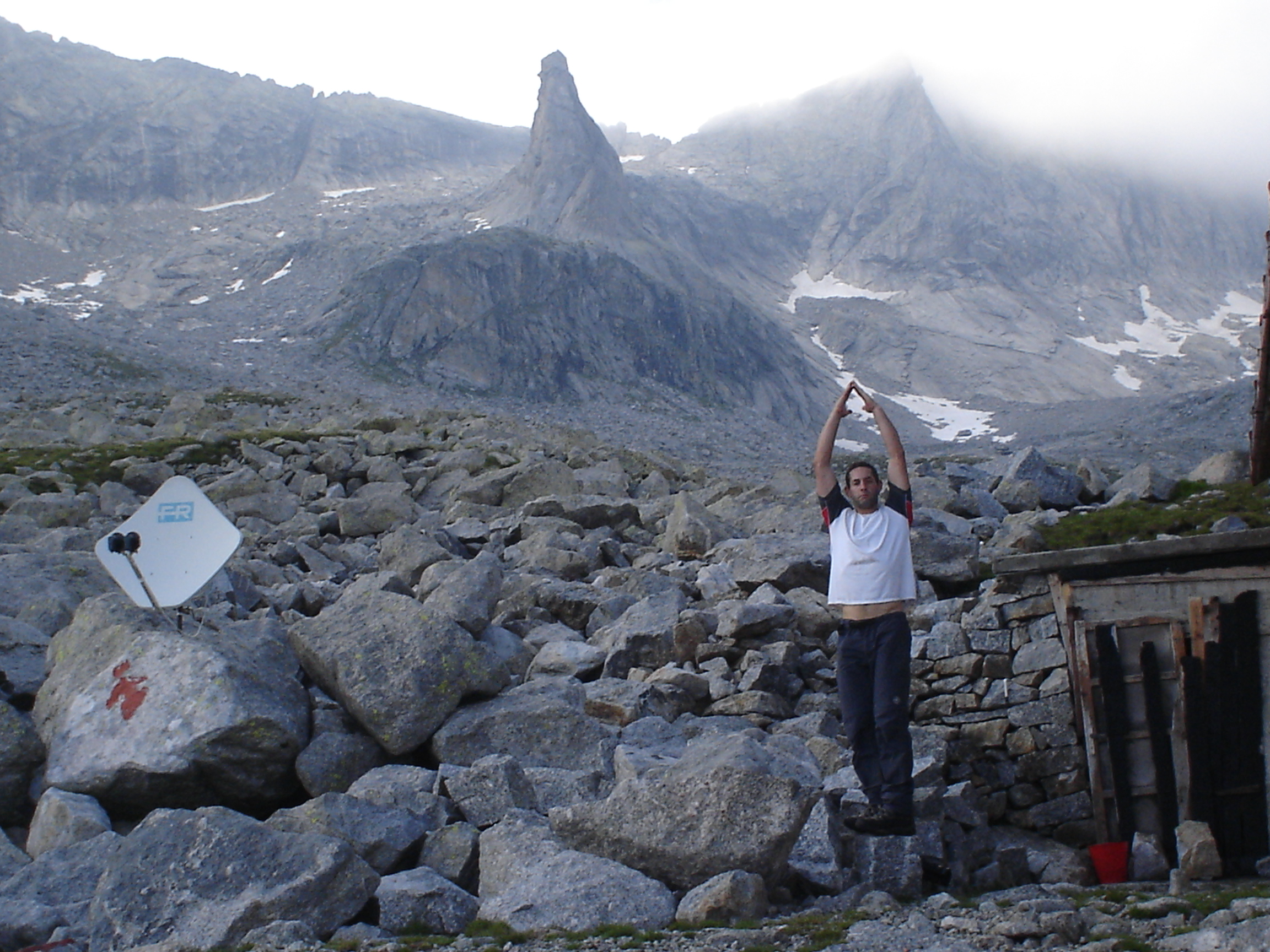 פה המקום לציין שמסיבה שעדיין לא ברורה לי, היו הסלעים במעלה מכוסים בשלל צרעות קטנות ושחורות. איני יודע מאין באו ומה עשו שם, אך משנוכחתי שאינן עוקצות, הפסקתי להסתכל איפה אני שם את הידיים ופשוט טיפסתי עם כפפת צרעות מעוכות כל הדרך למעלה. באחד המעברים הצרים הבחנתי פתאום ברוג'ום בודד וקטן, שכאילו אמר – "אם אתה רואה אותי אז יופי לך, אבל אני לא אראה לך לאן ללכת מפה". המשכתי למעלה, הסופה התחזקה והתחיל לרדת ברד. ירד ערפל כבד ורק כעבור 6 שעות של טיפוס מתיש הגעתי לנקודה הגבוהה של אותו היום. שם גיליתי, להפתעתי, תחנת מזג-אוויר מעוגנת בחוזקה לסלע ונראית טוב (יחסית לתחנת מזג-אוויר כמובן). למראה הטכנולוגיה המתקדמת התמלאתי שוב כוח ופצחתי בדהרה במורד השביל (המסומן הפעם) בדרכי לואדי הקרוב. בדרך למטה ראיתי שתי סלמנדרות אלפיניות, בנות דודות קטנות ושחורות לחלוטין של הסלמנדרות שלנו. בדיוק חשבתי על איזה יופי הדרך מסומנת כאן והופ! החלקתי על אחד הסלעים ונשלחתי ישירות, מטפס אחד ותיק גדול, בקפיצת ראש למדרון הסמוך. הנפילה לא הייתה חמורה ואחרי שניים שלושה גלגולים נעצרתי. לקחתי אוויר, והמשכתי ללכת. ירדתי לוואדי (עוד 400 מ') ועליתי ממנו להמשך המסלול (עוד 400 מ') עד שמצאתי אחו נחמד, עם ערימת שלג לצידו ושם עצרתי ללילה