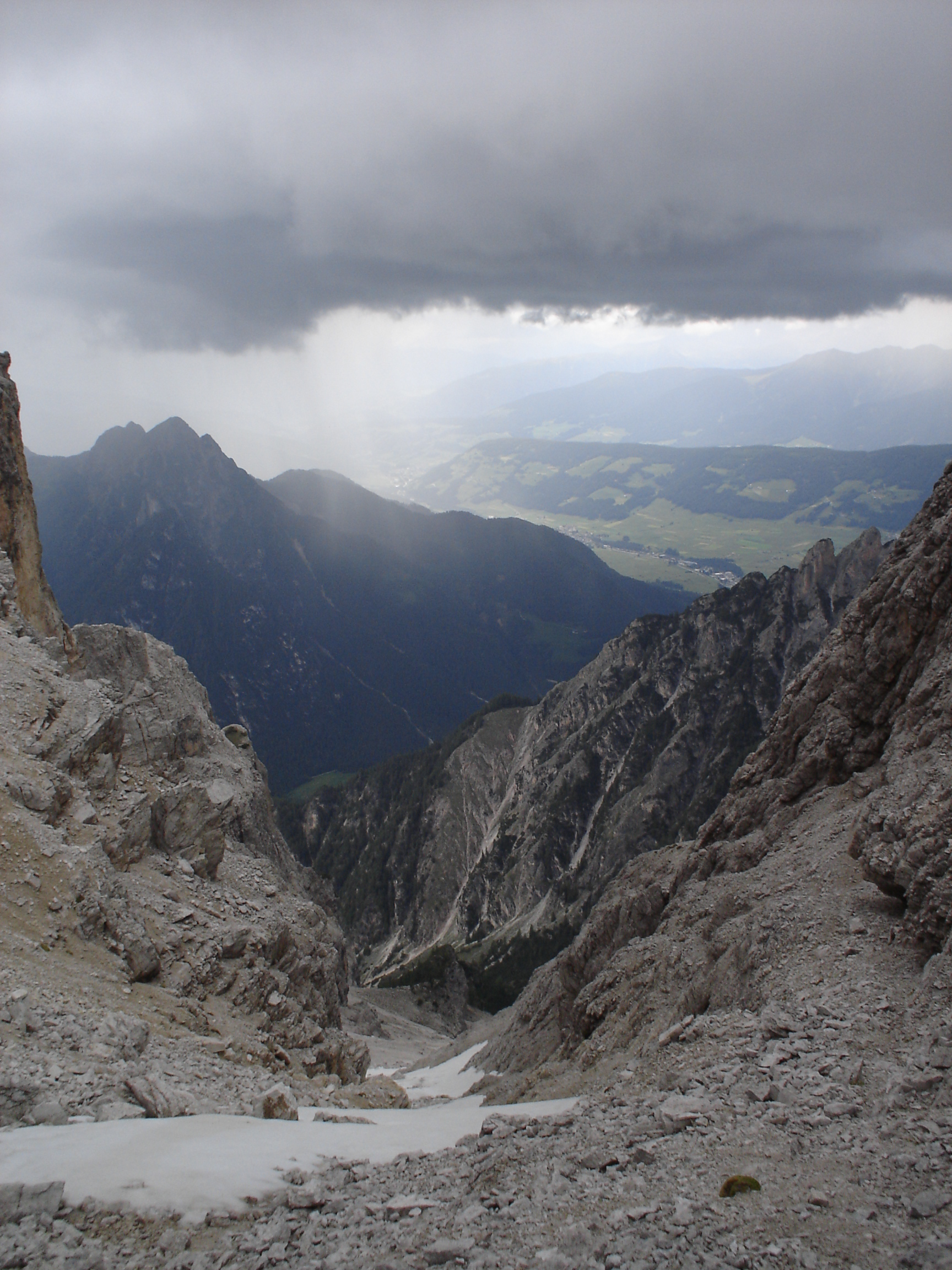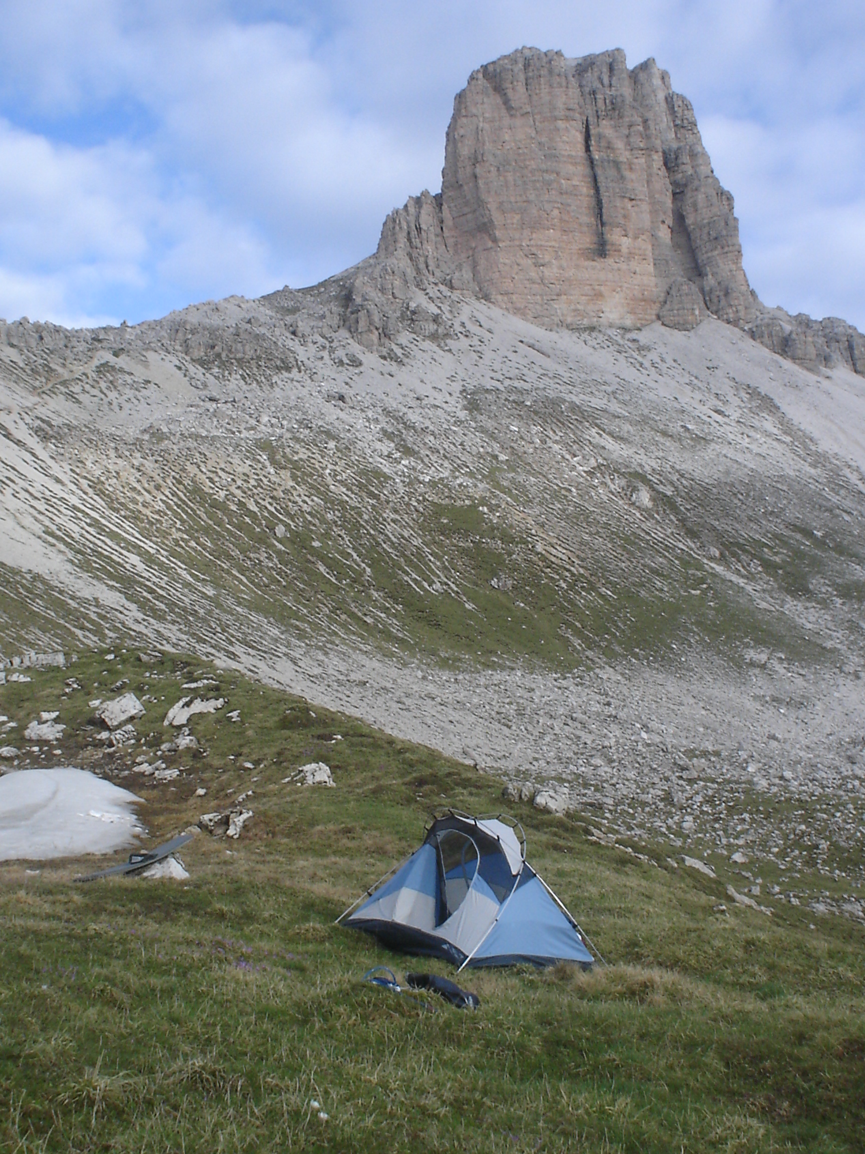 אחרי כ 4 שעות כבר הייתי בפאס הראשון בערך בגובה 2100 מ', שם נגמר השביל הטוב ומתחילות הנקודות השחורות שחותכות חזק ימינה מהפאס במעלה ההר (הנקודות היו רק על המפה – כן). השעה כבר הייתה לקראת צהריים, וכפי שחששתי, שמי התכלת של הבוקר התחלפו במהרה בענני גשמי-צהריים מבשרי רטיבות וקור. התחלתי לעלות בהר, מוצא את דרכי בעזרת המפה (סימונים לא מצאתי) ובעזרת המצוקים מזדמנים, שבערכם כסימני "דרך ללא מוצא" אין לזלזל. הסלע באיזור רך ומתפורר, שארית לשונית האלמוגים הקדומה ממנה בנויים הדולומיטים. הטיפוס נעשה תלול, עם תיק כבד (אוהל, שק"ש) וגשם – לא משימה קלה